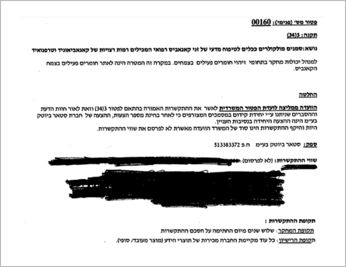 נושא ההתקשרות: המדינה נותנת רישיון על ידע בנושא קנאביס רפואי. המדינה מקבלת תמלוגים מהחברה.