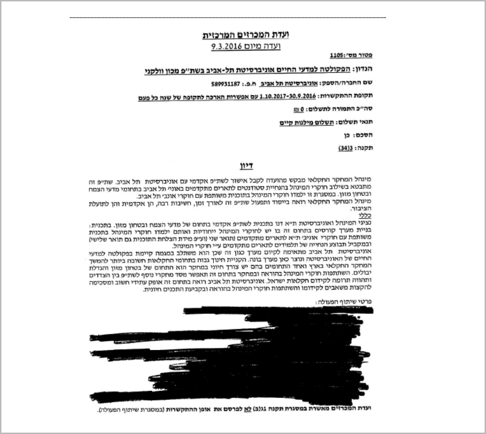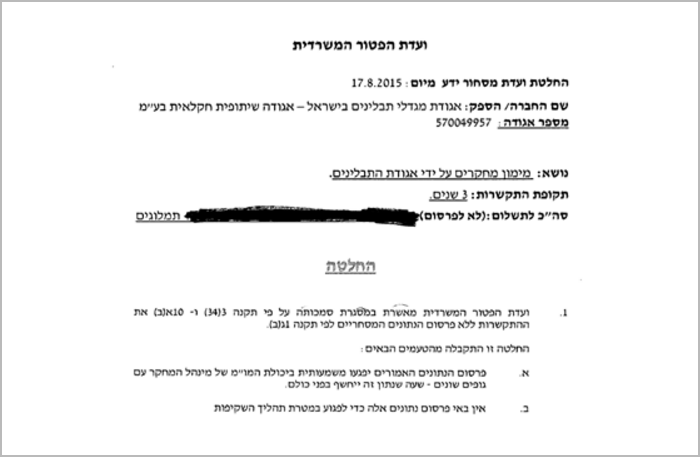 כך לדוגמה, ביוני 2015 התקשר המינהל עם חברת סטאר ביוטק בע”מ, למכירת ידע בנושא קנאביס רפואי. הסכום שקיבל המשרד בתמורה לידע נותר חסוי, ומושחר במסמך. במקרה נוסף, באוגוסט 2015, במסגרת התקשרות המינהל לשיתוף פעולה עם אגודת מגדלי התבלינים, קיבל המינהל כסף מהאגודה לטובת מימון מחקר. גם במקרה זה נמנע המינהל מלחשוף את הסכומים שקיבל מהאגודה. גם בהתקשרות נוספת של המינהל, עם החברה המרכזית למשקאות, לטובת מימון מחקר בנושא ממתיקים טבעיים, הסתיר המינהל את הסכום שקיבל מהחברה.