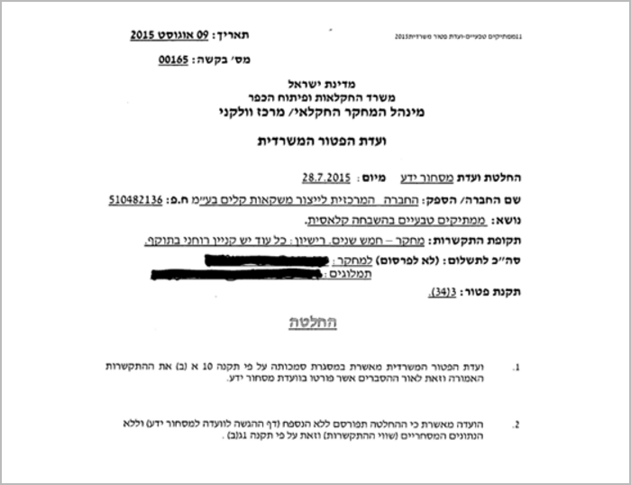 נושא ההתקשרות: מימון מחקר בנושא הפקה משמנים צמחיים להפחתה בתופעות נירודגרטיביות. הרישיון יהיה ברשות המדינה במשך 20 שנה.