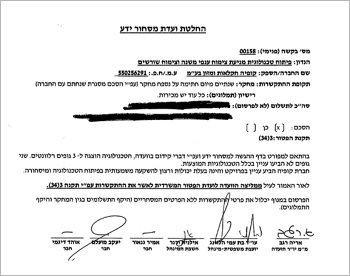 חלק גדול מהעסקאות של מינהל המחקר החקלאי נעשות בפטור ממכרז, והן שקופות לציבור ב”אתר מינהל הרכש הממשלתי”. אולם, מבדיקה שערכנו התגלה כי בחלק מההתקשרויות הללו נמנע המינהל לחשוף את הסכום שקיבל תמורת המכירה או הרכישה של הידע. במקרים אלו מפרסם המינהל את מסמכי ההתקשרות כאשר סכום ההתקשרות מושחר.