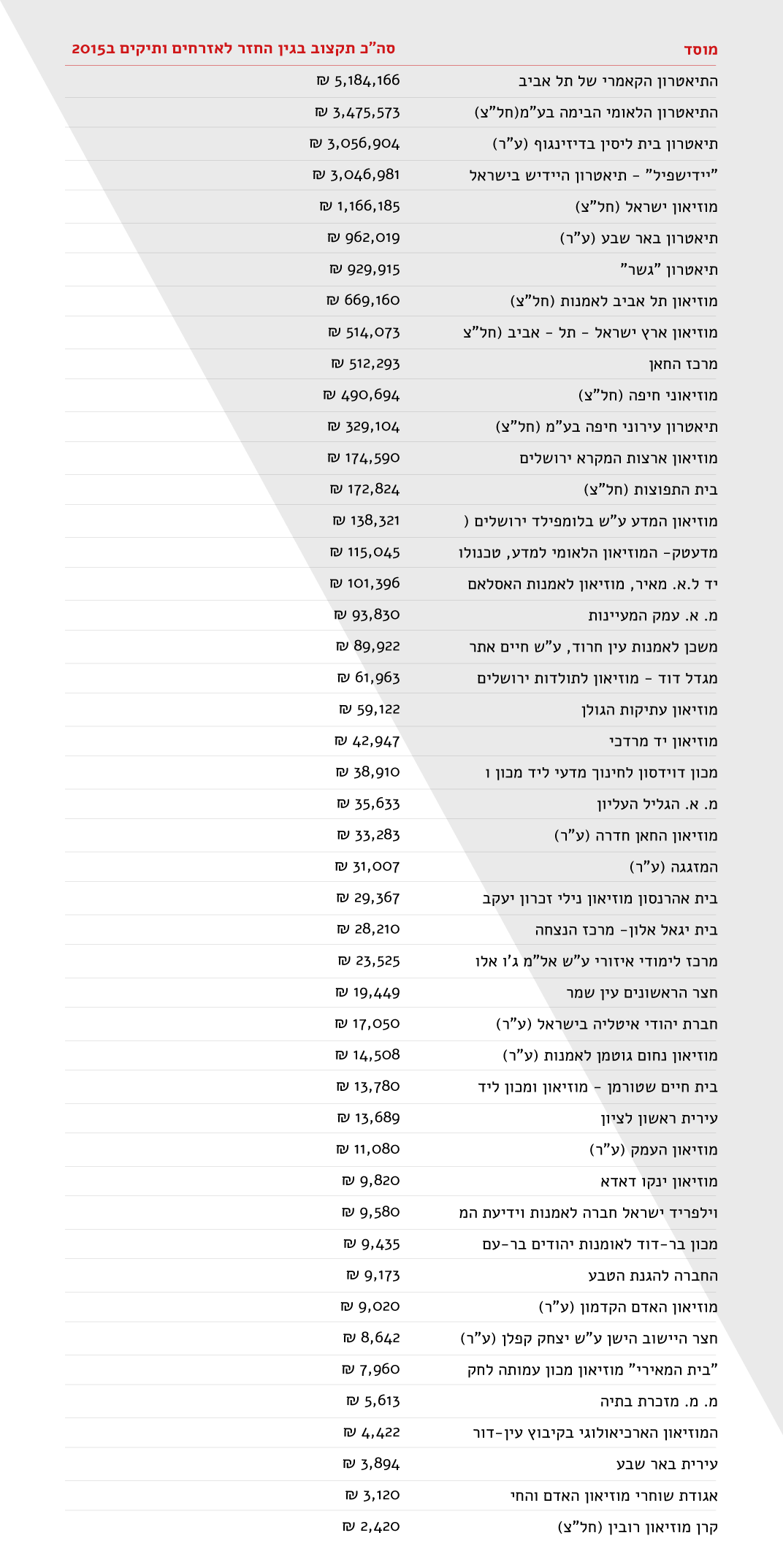 נתון מעניין נוסף עולה מתוך דו”ח ההתקשרויות לשנת 2015 שפרסם משרד התרבות. בין היתר, עולה מהדו”ח שהמשרד הוציא כ22 מיליון ש”ח בשנת 2015 על סבסוד תרבות לאזרחים ותיקים. בפועל, כ70% מתוך הסכום הכולל, מועברים ל4 מוסדות בלבד: הקאמרי, הבימה, בית ליסין ויידישפיל.